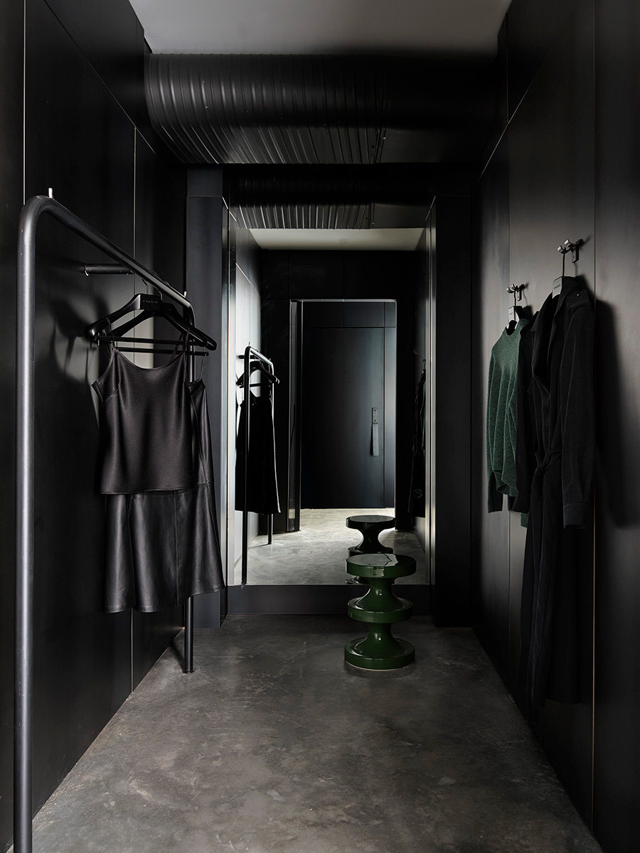 Greg’s interiors reflect his enduring appreciation for the hard-edged minimalism of late-80s and early-90s retail design, referencing these space, angular and ultra-modern fitouts with their poetic use of concrete and negative space. Interior stylist Maria Papantoniou sourced vintage Italian pieces to complete the project, upholstering them in jewel-toned velvets that pop against the pared-back setting while still feeling in sync with the modernist vibe.