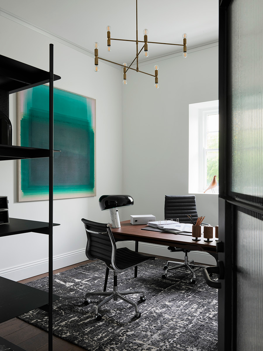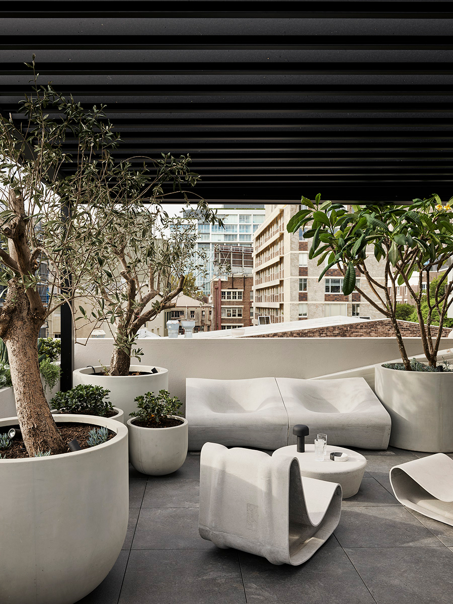 The next level up includes offices, meeting areas and a convivial rooftop terrace where a leafy planting scheme by Studio Botanica frames the inner-city outlook. Throughout the building, concrete’s raw, utilitarian quality is complemented by crisp white walls, black-patinaed metal, smoky grey marble and gallery-style track lights.