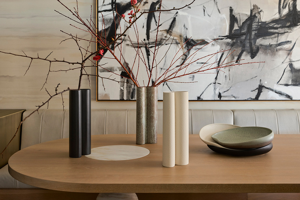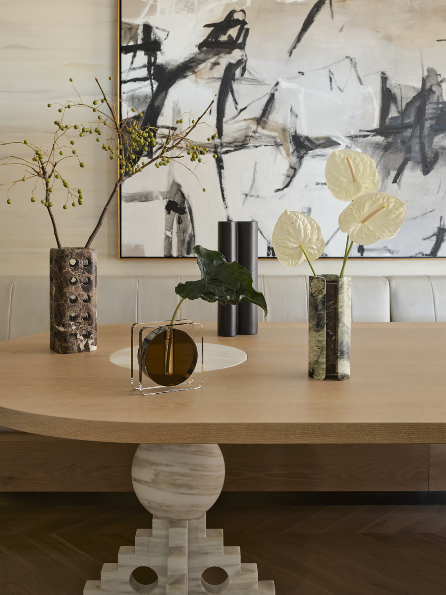 Their love for the art-deco inspire contemporary residence lead us to collaborate on a fresh take on this popular property – this time riffing on a palette of blush pink, grey and light timber floors. Furnished with a mix of Minotti and European vintage pieces, the four bedroom home is adorned with Greg Natale decorative accessories in marble, ceramic and the warmth of polished brass.