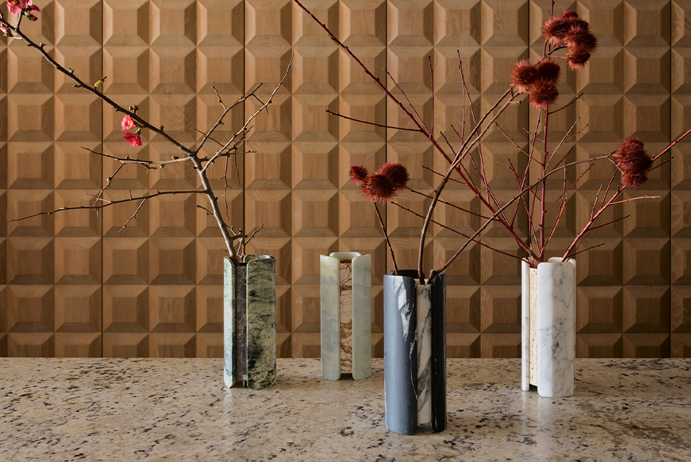 The custom spiral grey terrazzo stair features brass inlay with a limited edition piece from sculptor Dan Murphy taking pride of place at the foot of the stair. The master ensuite of the home creates a lasting impression with Greg Natale’s Moire pink mosaic tile design for Bisazza gracing the walls.