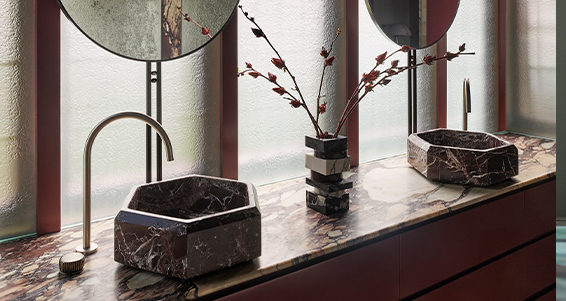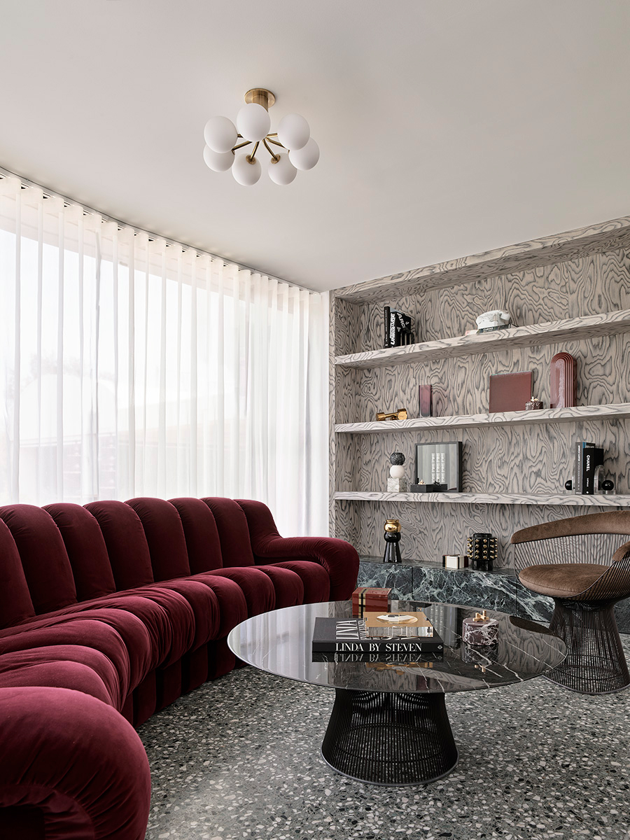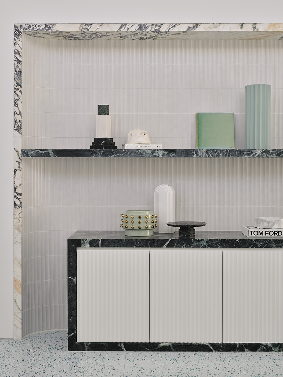 Connecting the living and dining area with the new kitchen is a feature wall of Calcutta Viola marble slabs, a reference to the Barcelona Pavilion. Abiding by a modernist grid of the home’s structural architecture, new walls of marble around what was originally a kitchenette create a concealed scullery space, and a new show kitchen equipped with a custom island and fitted with fluted joinery serves to provide a casual, family-style dining experience.