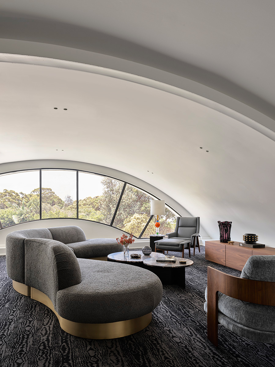 While the exterior of this villa-style home on the Central Coast is emblematic of 1980s architecture, Greg Natale revives the interior with contemporary flair for modern family living. Built in 1985, this postmodern palace features original columns and terrazzo floors that now lay the foundation for modern, open-plan living. Greg Natale introduced a palette of white and blue-green tones to evoke a clean, gallery-esque feeling before adding layers of soft furniture upholstered in warm orange and deep red fabrics. Playful nods to postmodern aesthetics are made throughout, including custom shelving finished in a swirling veneer created by Ettore Sottsass.